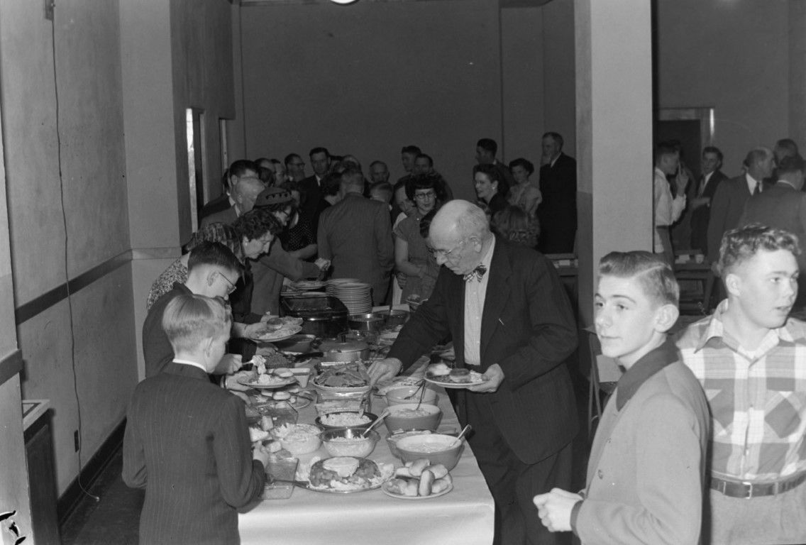 A long line of individuals waiting in line to make their dinner plates at the Future Farmers of America awards ceremony.
