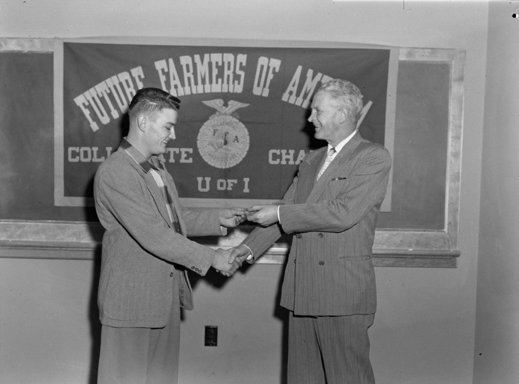 An older man in a suit is presenting an award to a younger man and shaking his hand at a Future Farmers of America event.