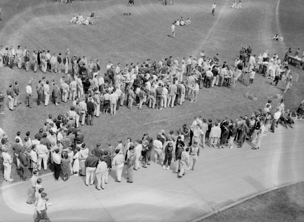 A large group of individuals waiting in lines on a field in front of the Administration Building.
