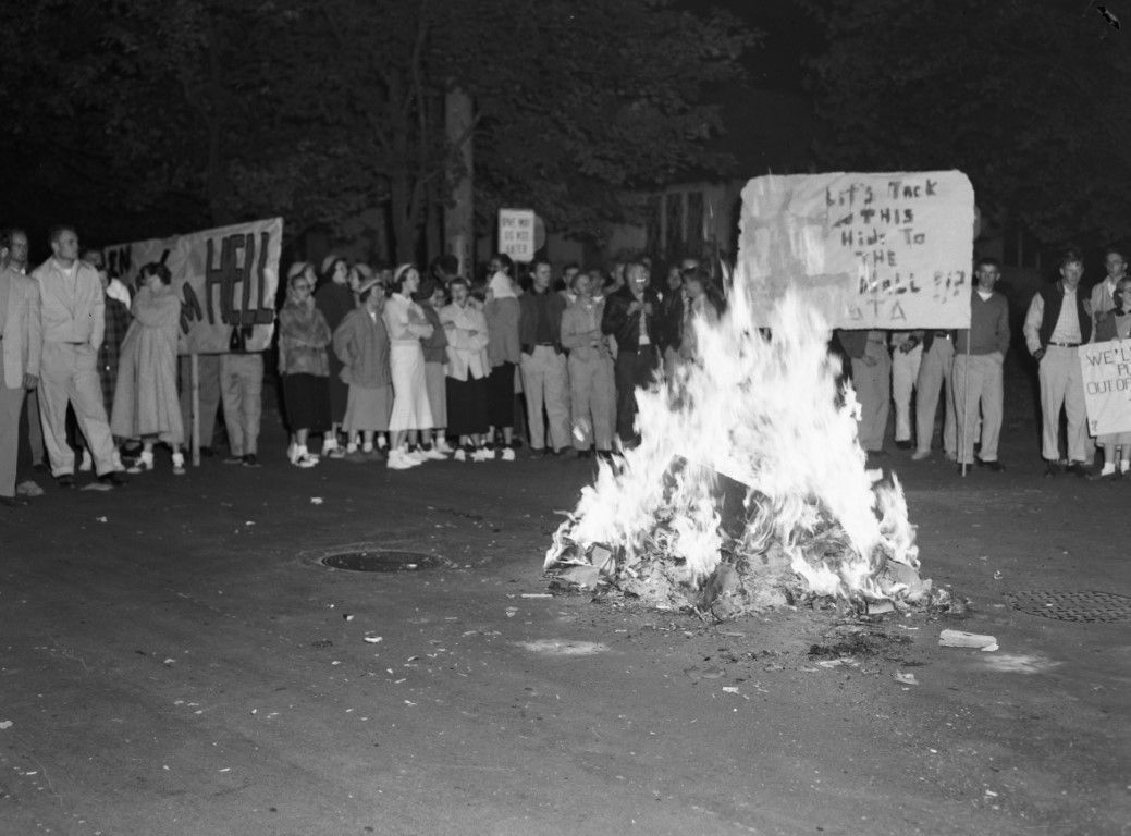 Students holding signs at a rally are gathered around a bonfire in the street.