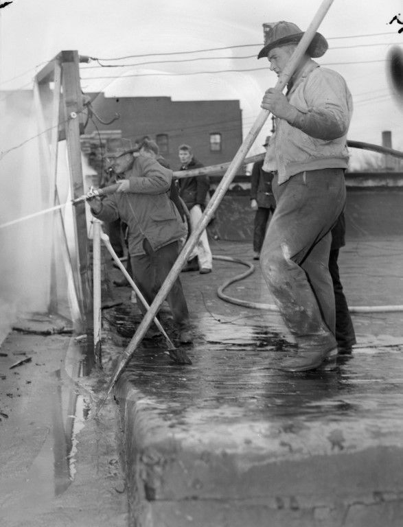 A group of men with hoses extinguishing a fire on a rooftop.