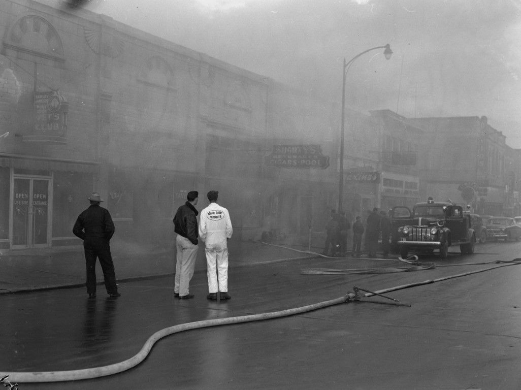 A firetruck, crew, and spectators at a commercial building fire on Main Street. Two businesses - Shorty's Beverages and Maxine's - are in the photo.