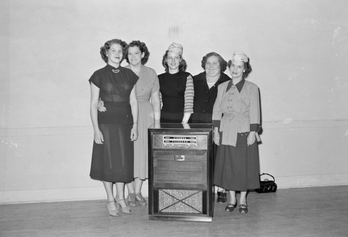 Five women standing behind a radio