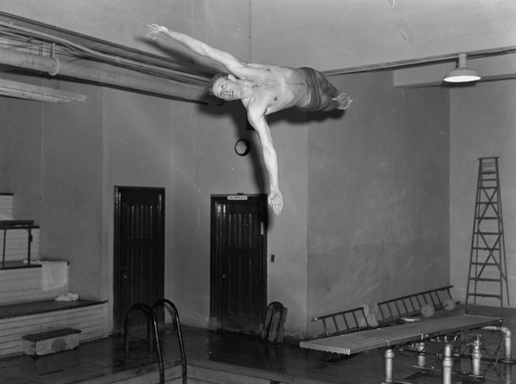 A man horizontally in the air with his arms spread open after jumping off a diving board.