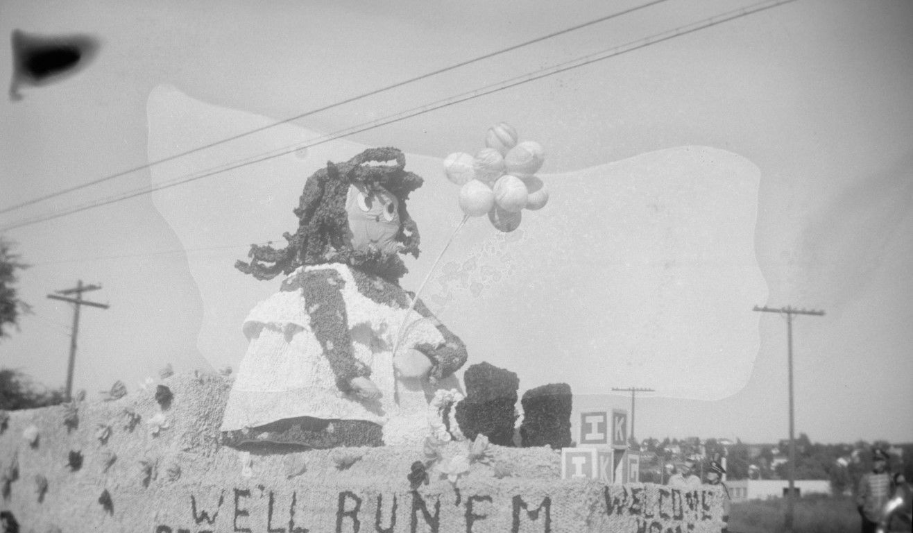 A parade float that features a girl in a dress holding balloon. The side of the float reads "We'll Run'em."