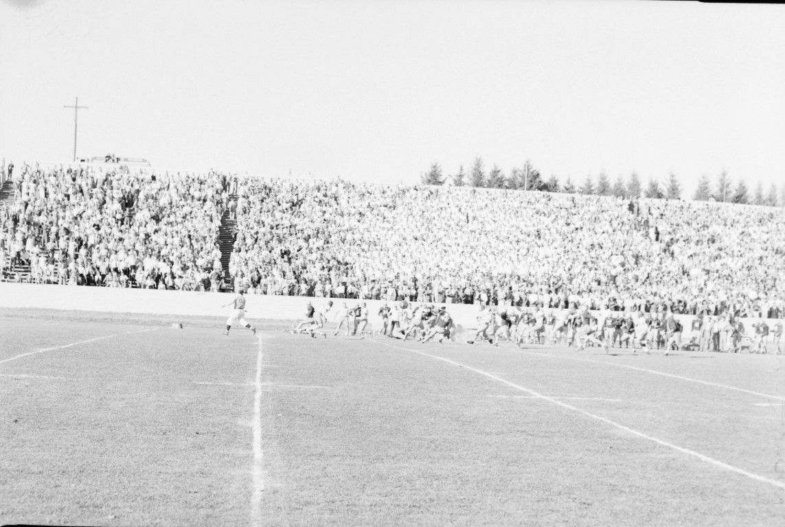 A wide camera shot of action on the field in front of a packed house of spectators.
