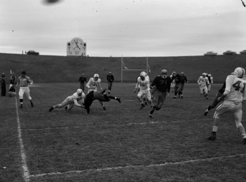 A football player carrying the ball is going to the ground as the defensive players converge around him. A large play clock can be seen on the hill above the field along with several parked cars.