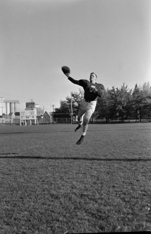 A football player in uniform with no helmet is catching or passing the ball on the field.