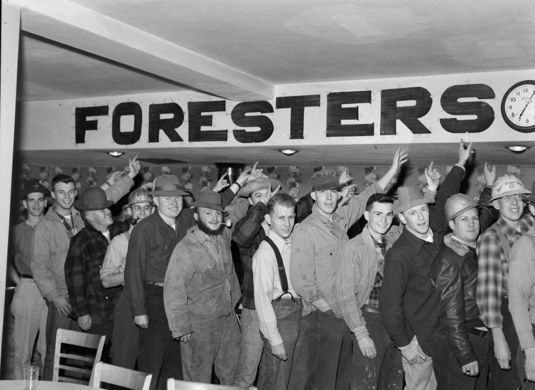 A group of men pointing at a sign that reads "Foresters" near the ceiling. Some of the men are wearing hardhats. They are in a restuarant or cafeteria.