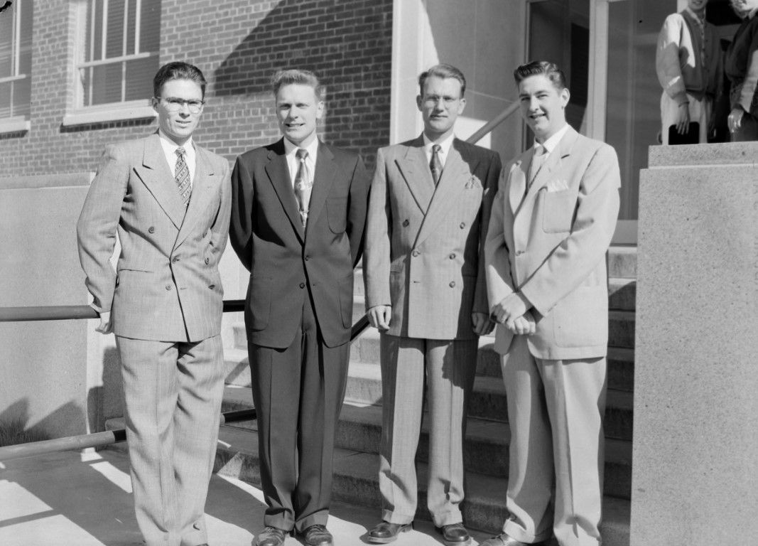 Four men wearing suits are standing on the stairway in front of a brick building.