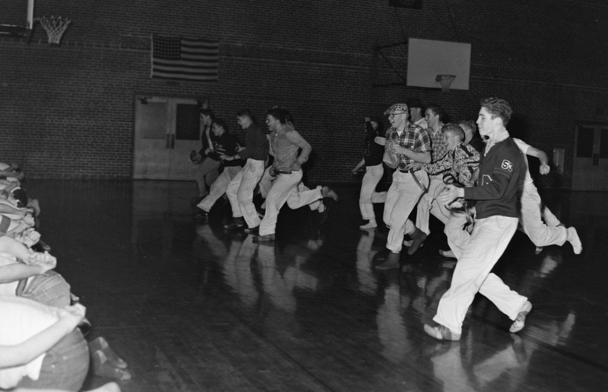A group of young men in the gymnasium is running toward a line of other young men who are bent forward on their knees with their hands clasped behind their back.
