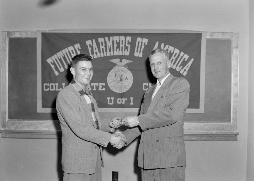 An FFA member - Collegiate Chapter - is receiving an award and being congratulated.