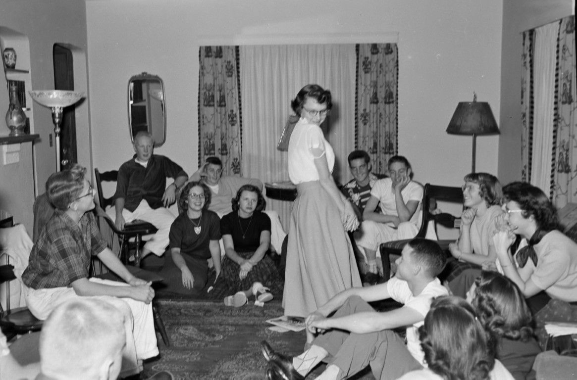 A group of young people seated around a room with one woman standing in the center looking demurely at one of the men.