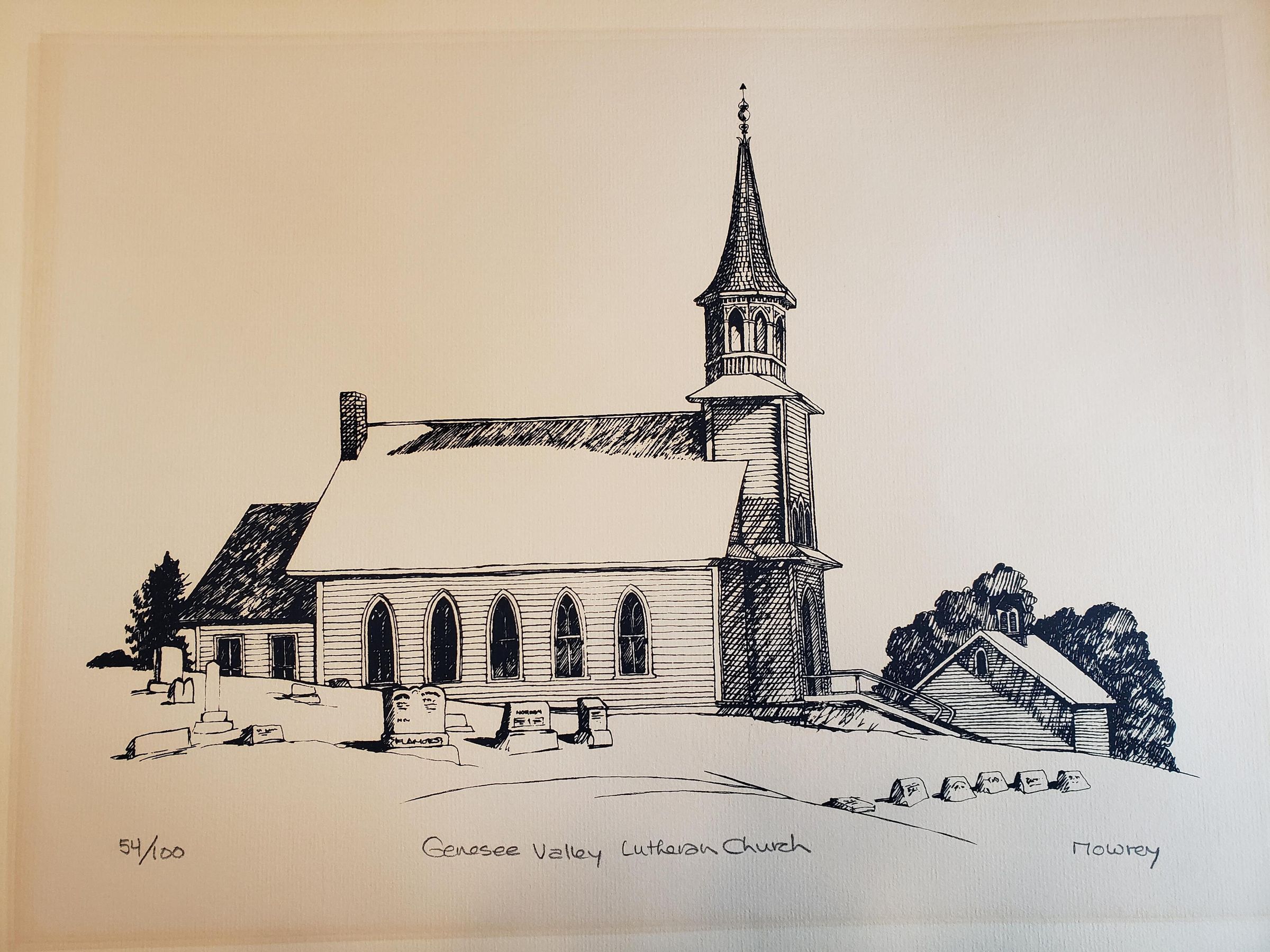 Line drawing print of the Genesee Valley Lutheran Church by artist Liz Mowrey. 54 of 100 prints.
