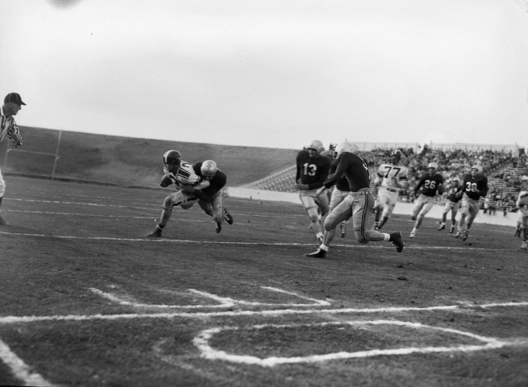 A football player carrying the ball is being tackled near the 30-yard line in front of a crowd of spectators seated in the stands. Neal Stadium U of I