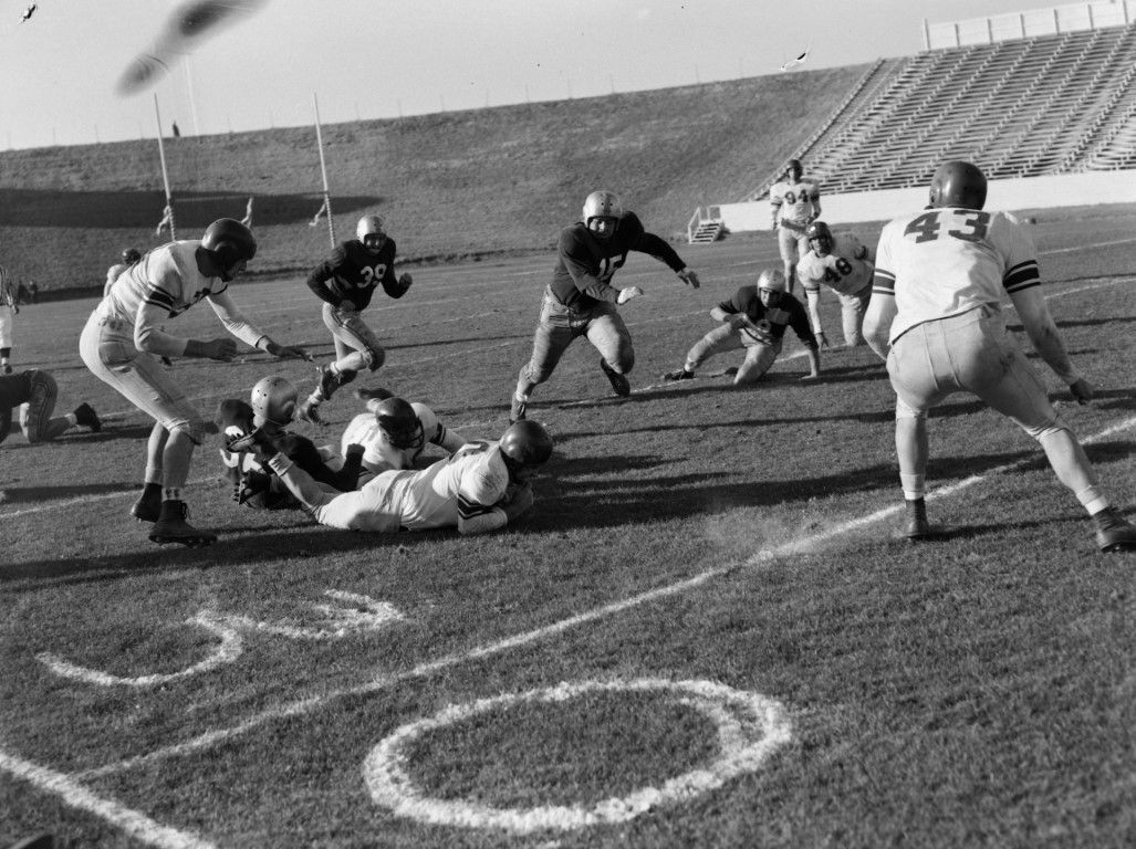 A football player has been tackled near the 30-yard line. Members of both teams are running toward the play.