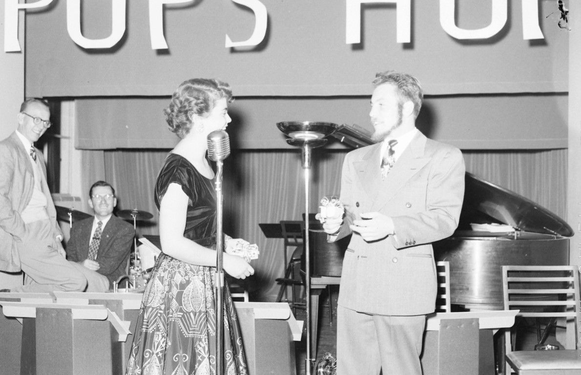 A man in a suit is presenting a small gift box to a woman in front of a stage set with musical instruments.