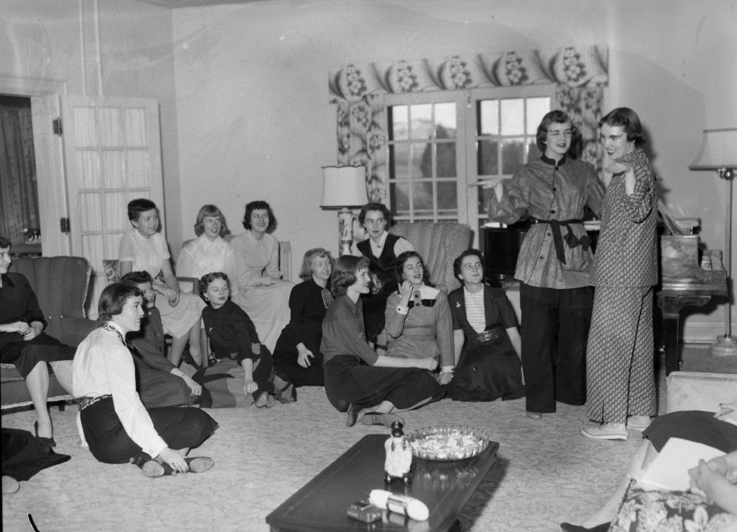 A group of young women are gathered in a living room and looking at two people who are standing and gesturing while dressed in pajama-like attire.