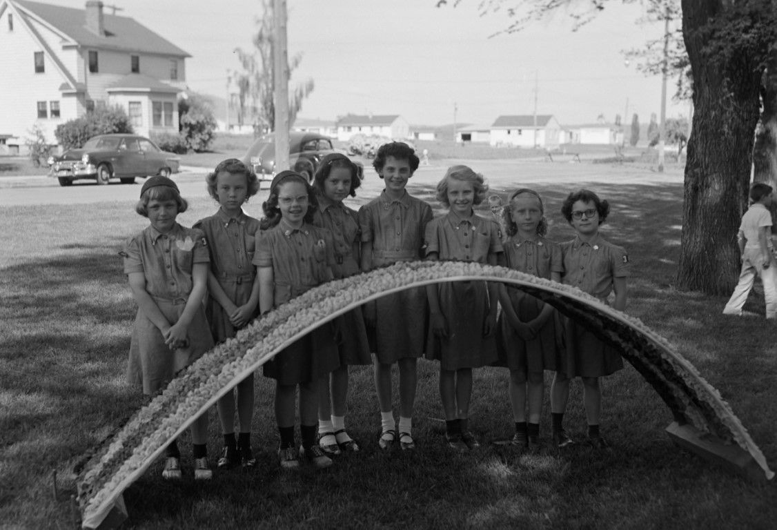 A group of eight girls in Brownie uniforms standing behind a rainbow arch in the northeast area of East City Park, 1st Street and Hayes Street intersection behind them.