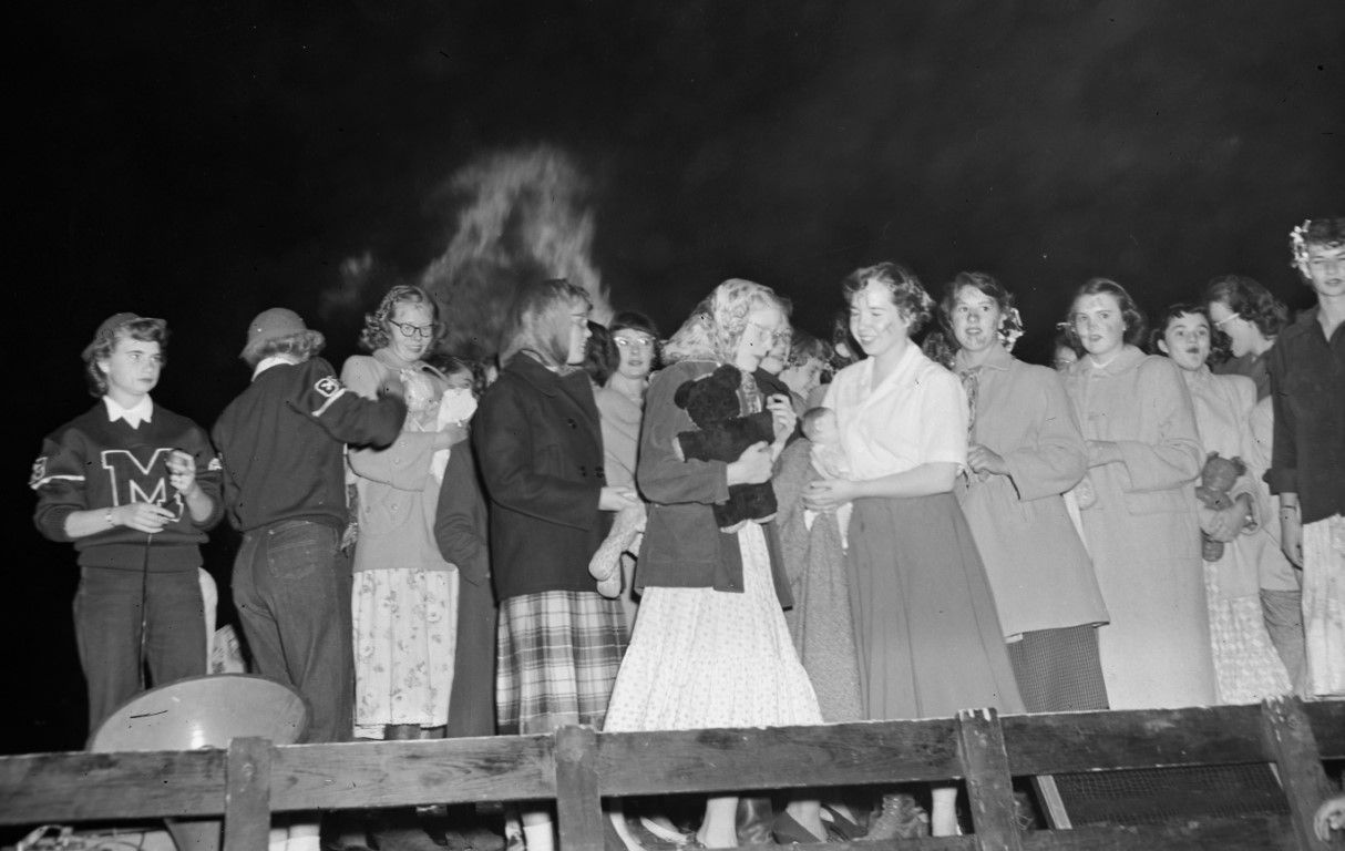 A group of young women - some holding teddy bears or dolls - are standing on a platform in front of the bonfire.