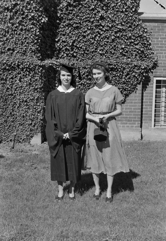 Two women posing for a photo in grass in front of a brick wall covered in ivy. One woman is wearing graduation cap and gown.