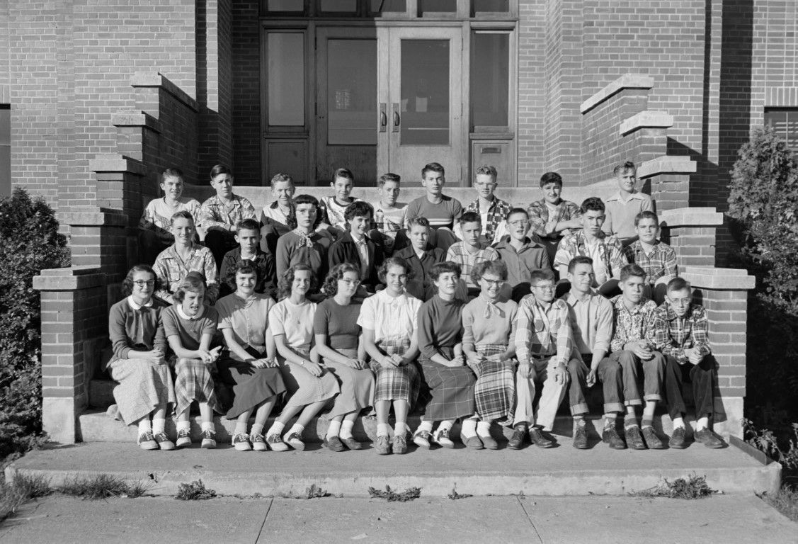 A group of young people posing for a photo on the outside stairs of a building.