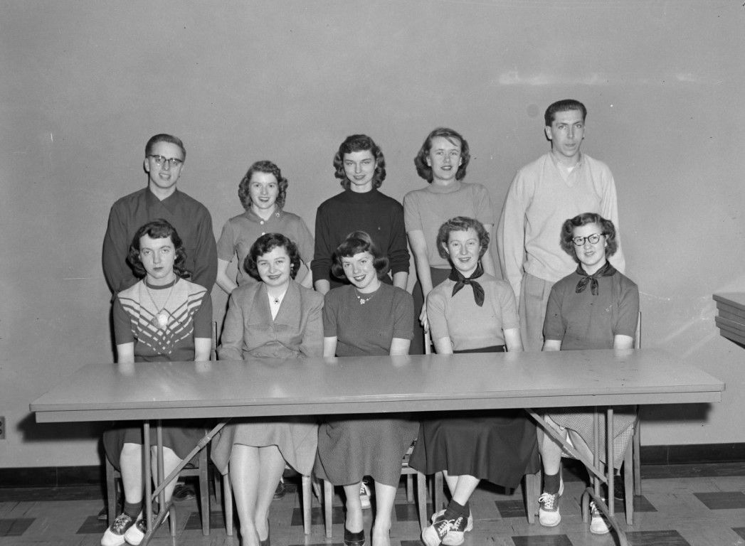 Several young women and two young men sitting or standing behind a table for a group photo.