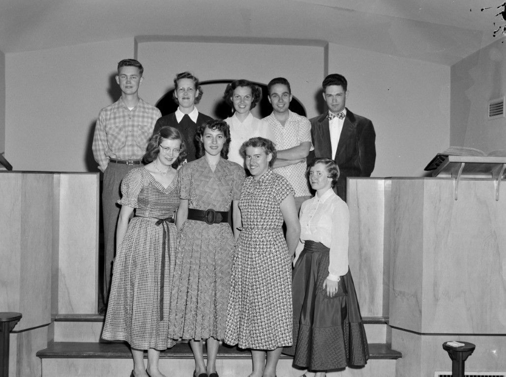 A small group of young men and women are posing for a group photo on the steps of a sanctuary.