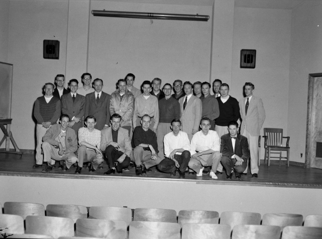 A group of men on a stage is posing for a photo.