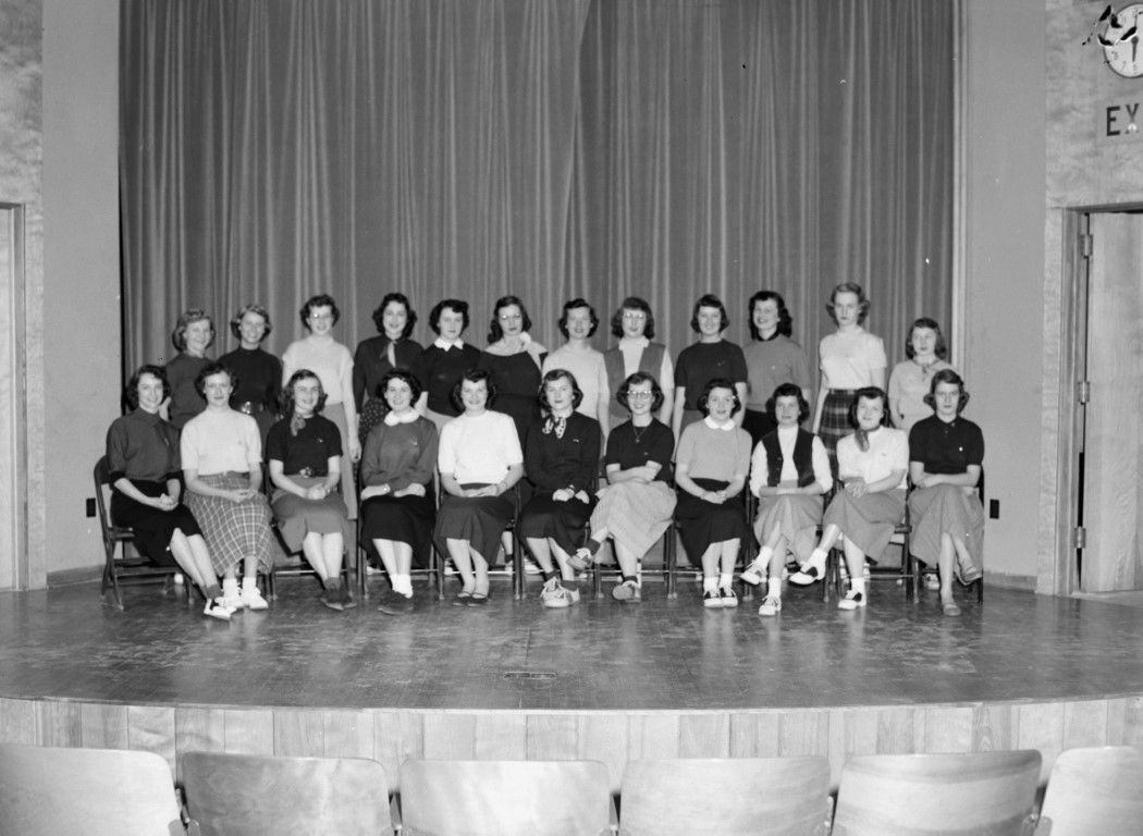 A group of young women are standing or sitting on a stage for a group photo.