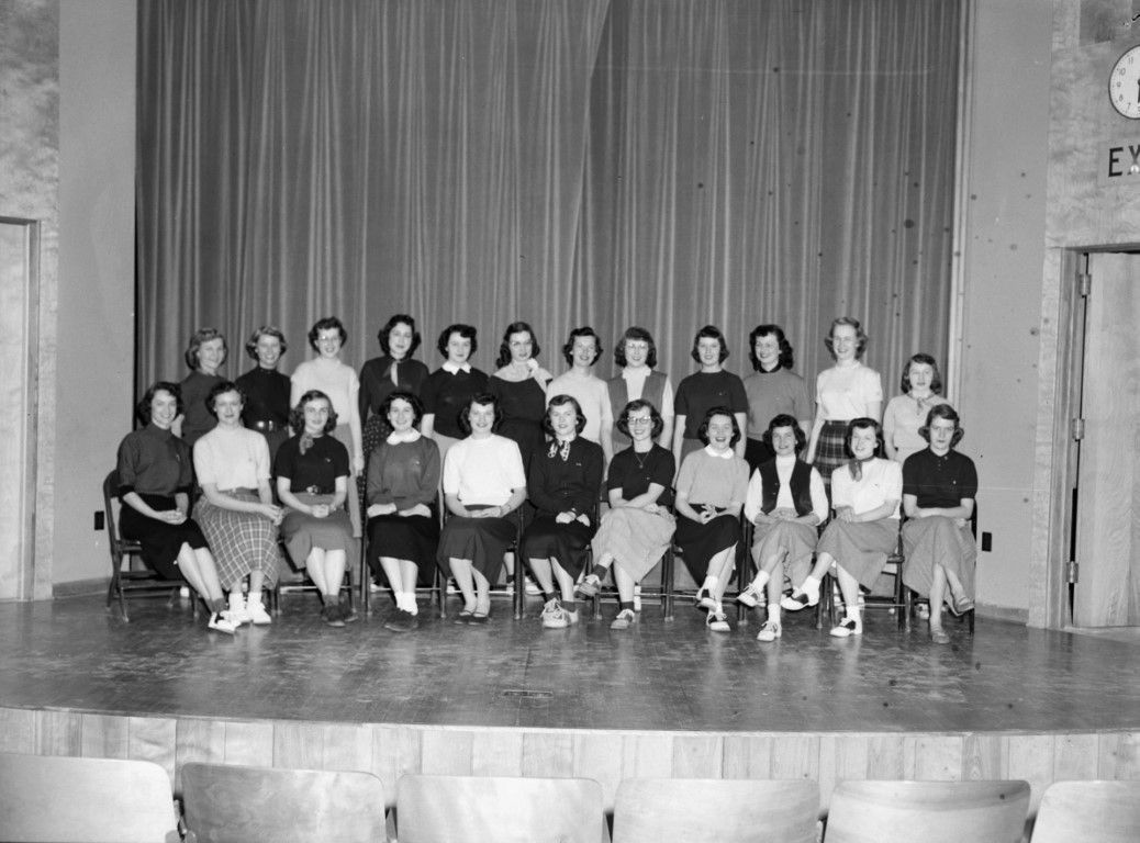 A group of young women are standing or sitting on a stage for a group photo.