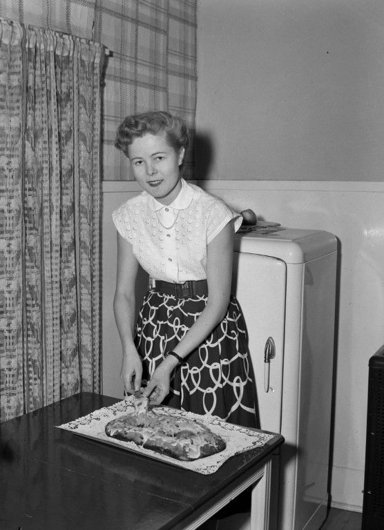A young woman standing in a kitchen slicing a baked roll on a doily.