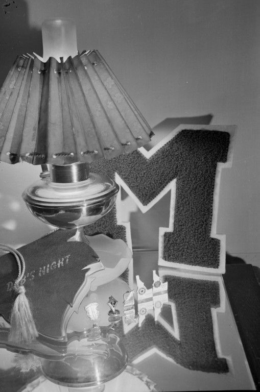 Moscow High School letter patch and other mementos displayed on a lampstand.