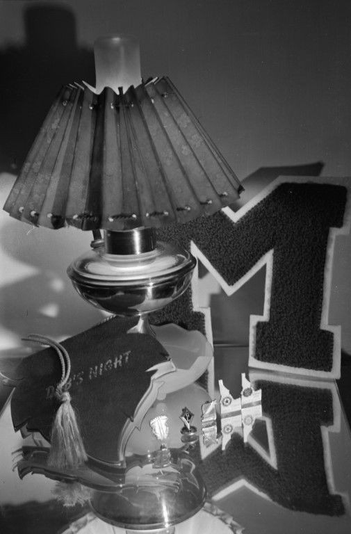 Moscow High School letter patch and other mementos displayed on a lampstand.