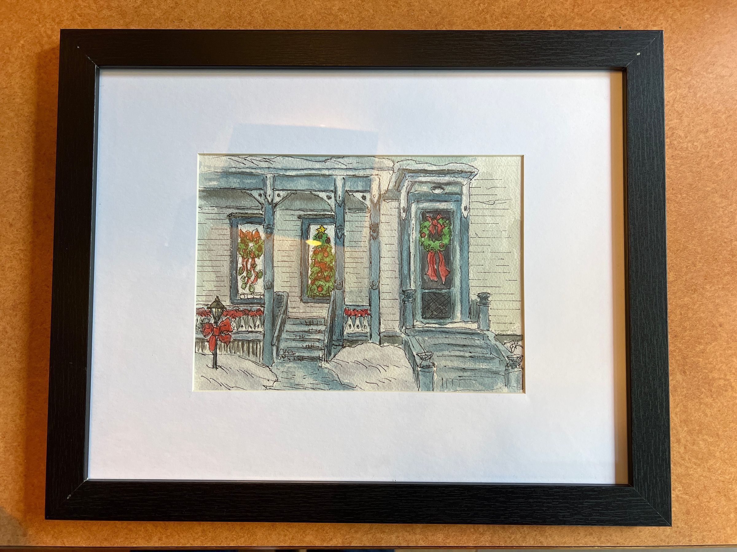 Framed painting of the McConnell Mansion during the winter with the house decorated for Christmas. The scene is of the front porch and showcases the original entryway and the current entryway.