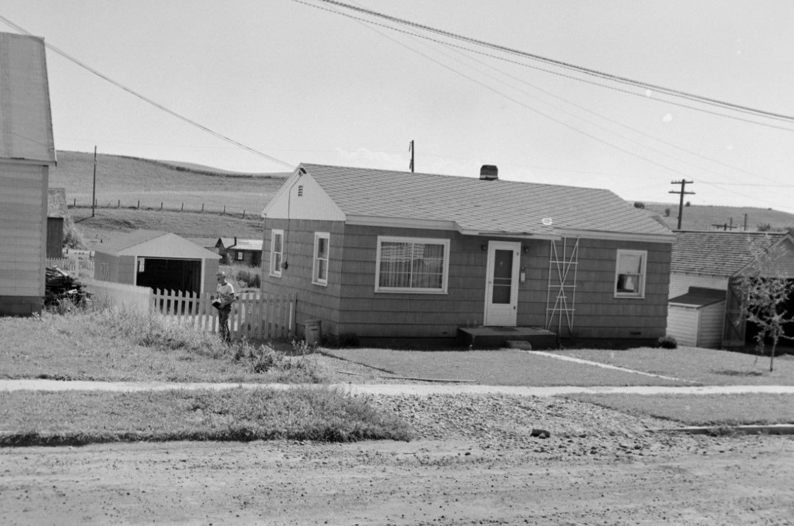 The front and side of the house in 1189, picket fence at the side, a man standing in front of fence