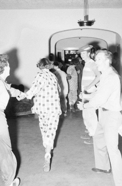Women in a line - in strange attire - forming a human chain by holding hands, while some laughing young men stand behind them.