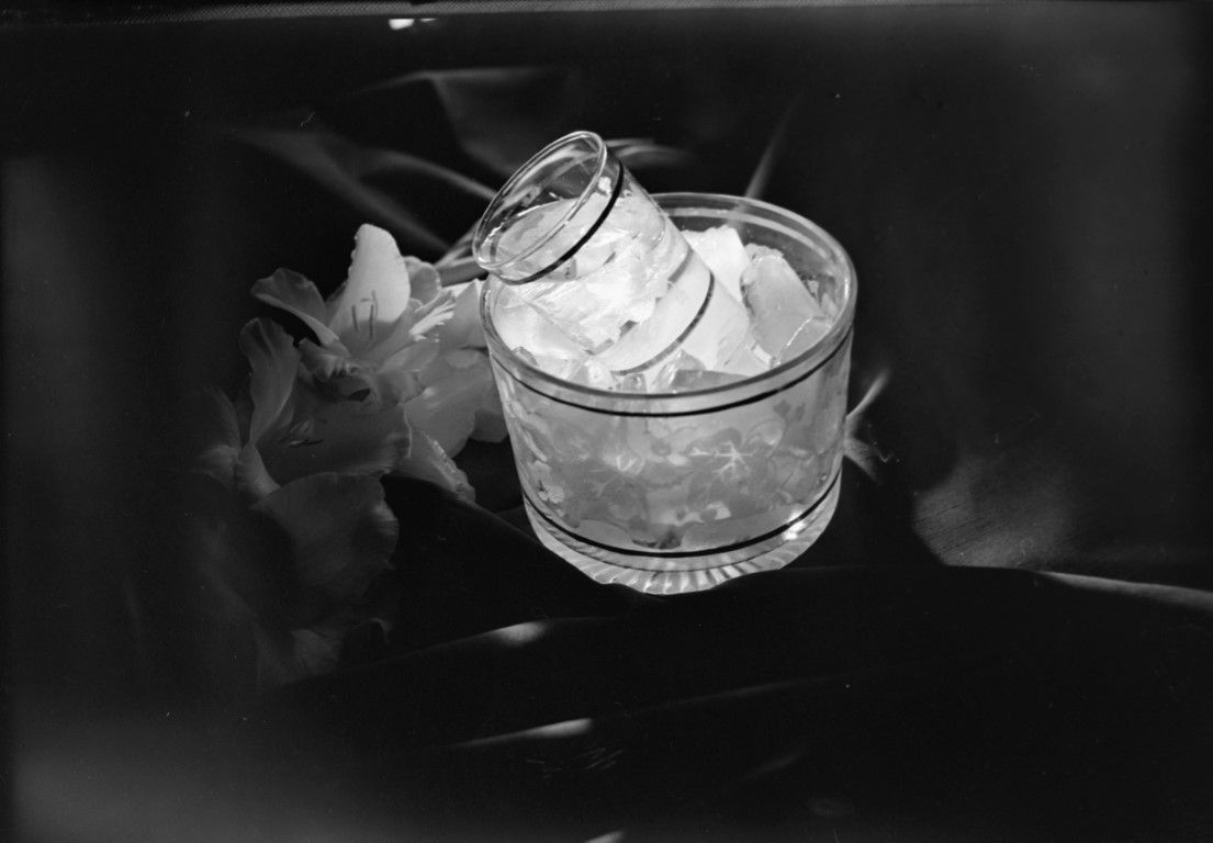 A glass full of clear liquid sits in an a glass ice bucket full of ice, both have the same etched leaf design and bands around top and bottom. They sit on a draped cloth with flowers arranged beside them. Similar to 1138.