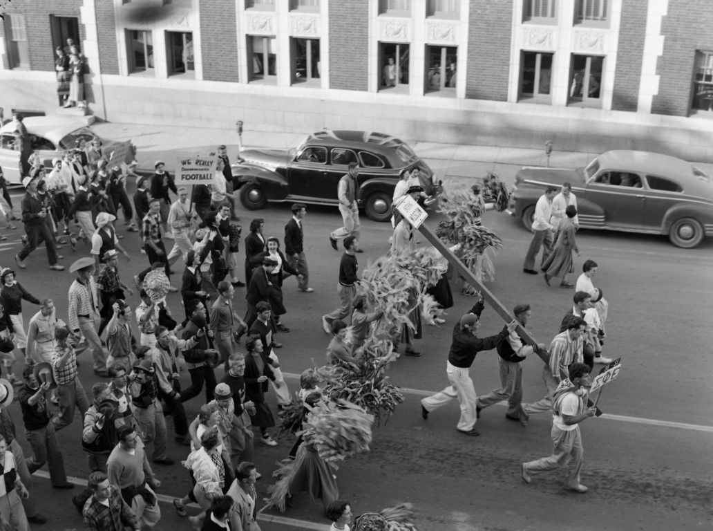 A parade march of University of Idaho students carrying signs celebrating a football win. Sorority and fraternity groups also participated in the parade. Individuals are watching the march through building windows.