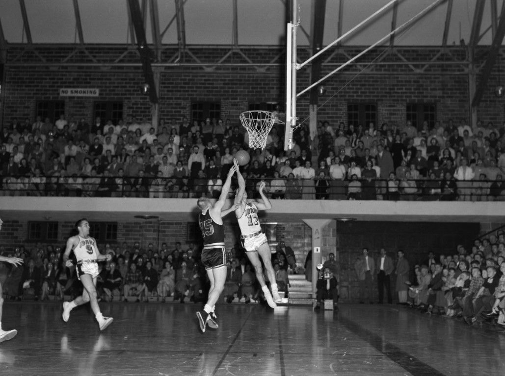 A University of Idaho basketball player shoots the ball near the basket as an Oregon State player contests the shot. A large crowd watches the action from the stands.