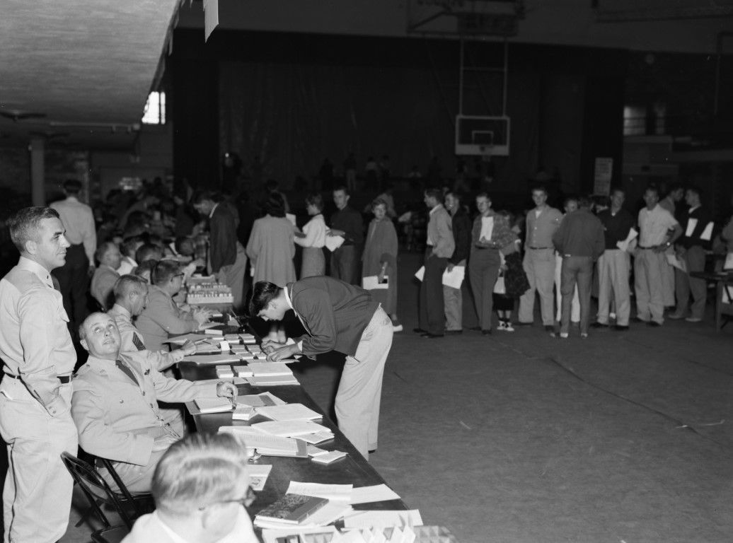 A group of young men and women standing in line waiting to get papers. They are in a gym.