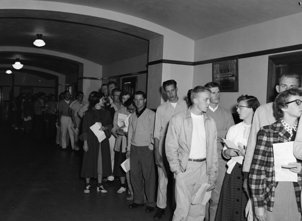 A group of young men and women standing in line with papers in their hands.