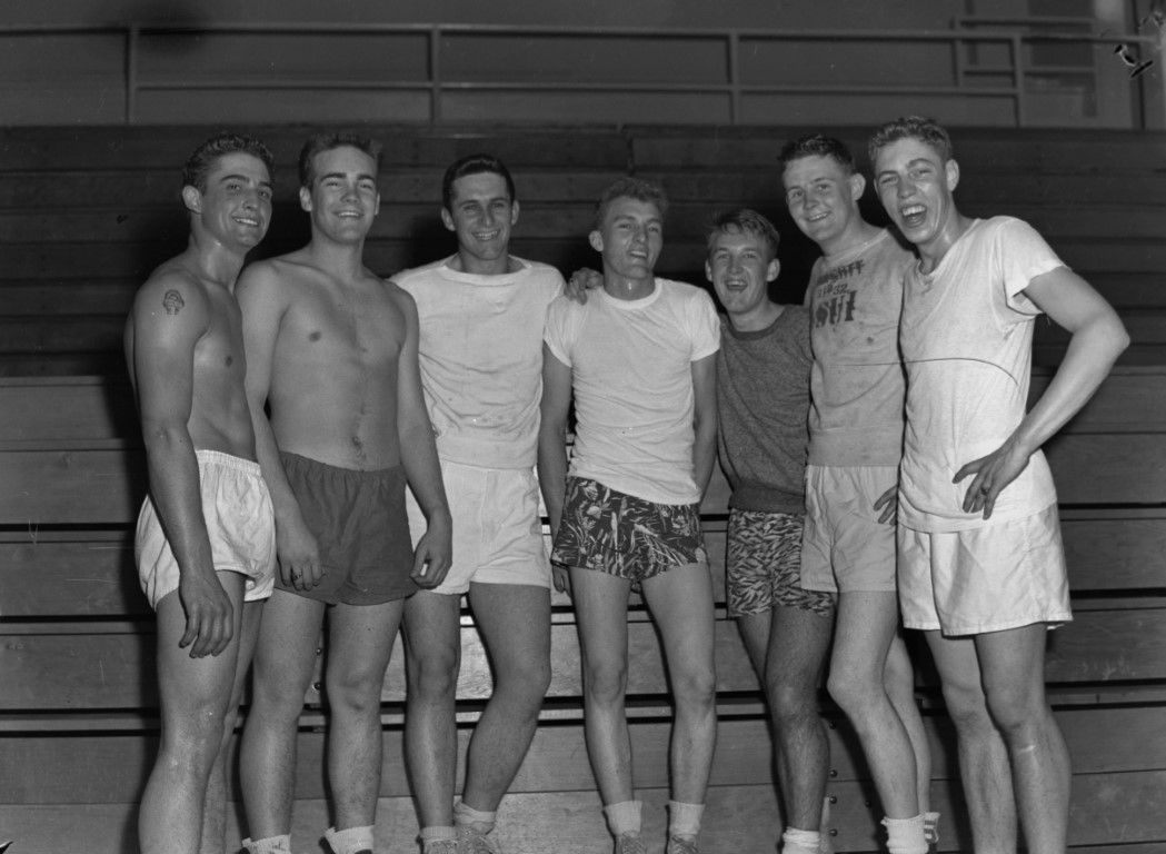 Seven smiling young men in gym clothes posing for a picture.