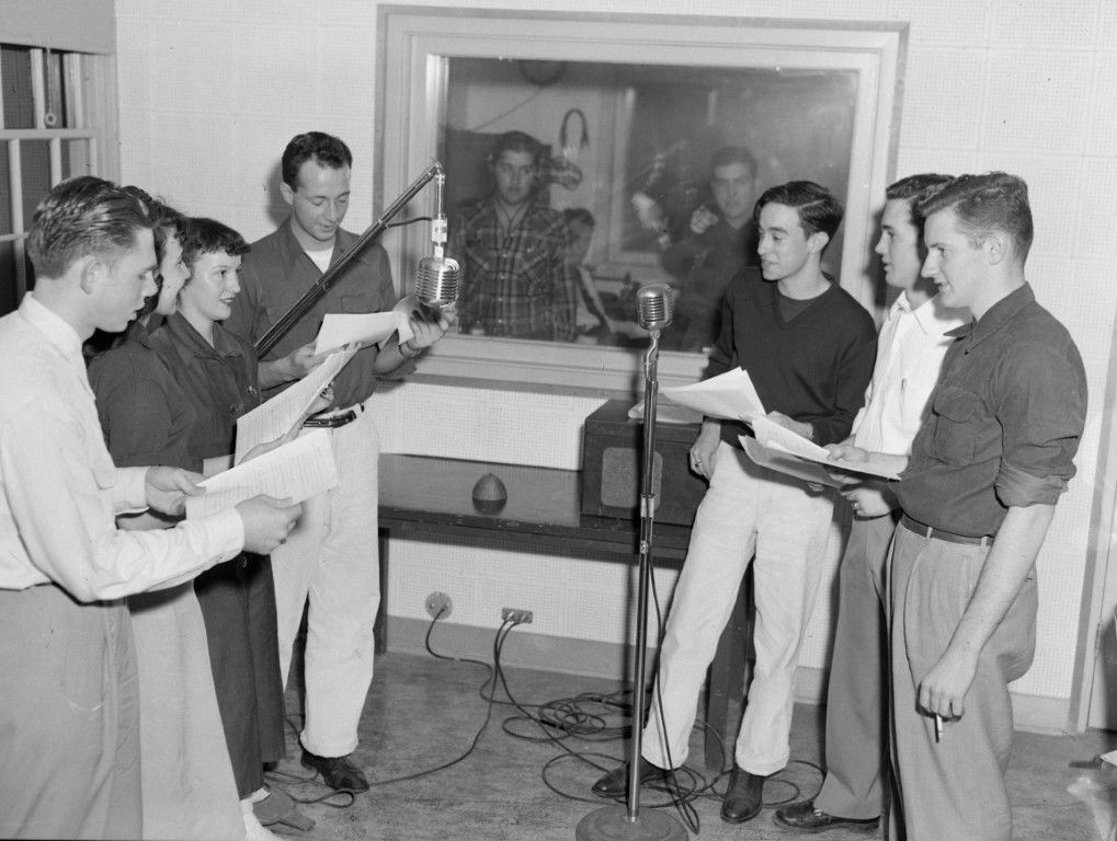 A group of young men and women in a recording studio with men in the sound booth listening.