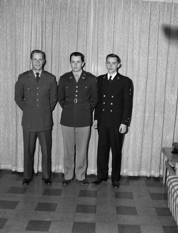 Three young man in military uniforms standing in front of a curtain.