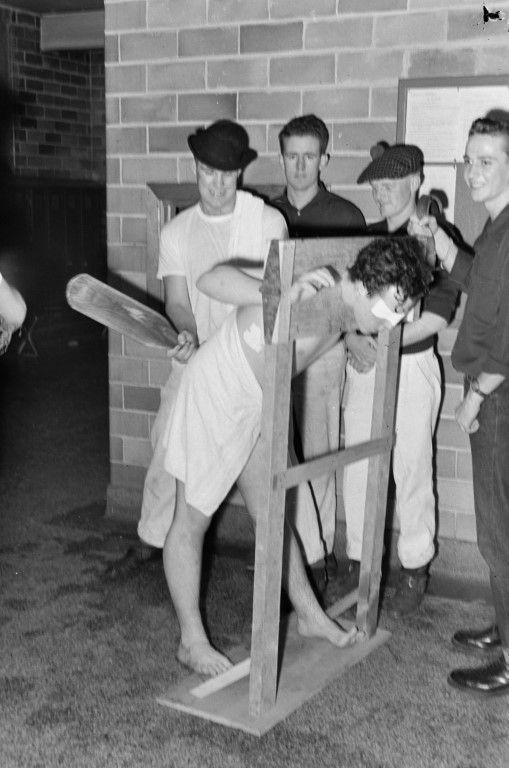 A young man is secured in a pillory and is receiving a paddling from another guy with three others looking on.
