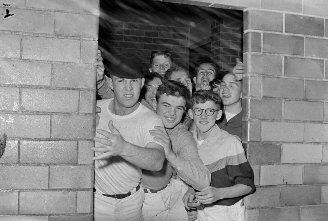 A group of young men standing in an opening to a small room in a cinder block wall.