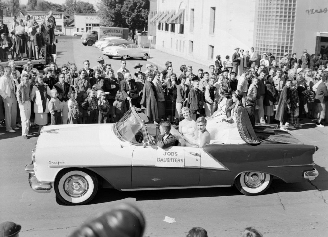 A young man driving an Oldsmobile Starfire convertible in a parade with five members of Job's Daughters sitting in the back. A sign with "JOB'S DAUGHTERS" painted on it is taped to the driver's side door.