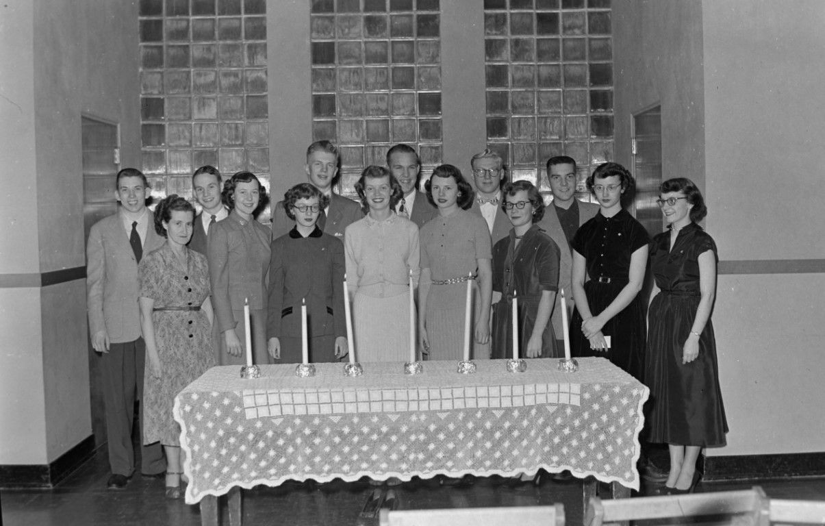 Well dressed young men and women standing behind a table on which candles are set.