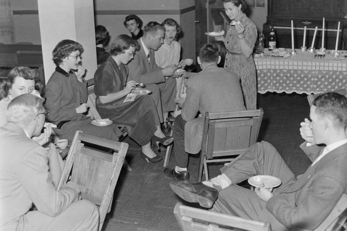 Journalism class members enjoying refreshments during a reception.